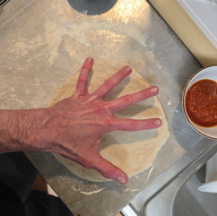 Pick up the dough ball, and stretch it with your thumbs and pointer fingers, further forming the edge of the crust. When the dough is about 20cm (8 inches), stop stretching. If the dough tears, just pinch it closed. It will be okay, but try not to tear it. Be gentle, it's your little dough baby.
